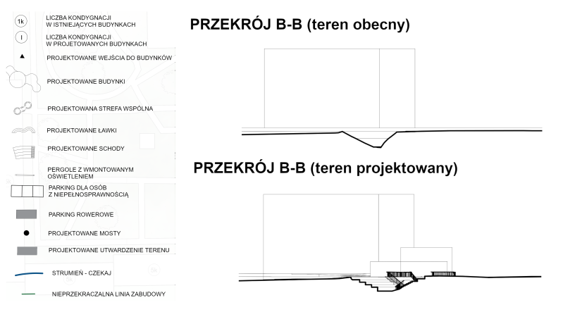 W ramach projektu planuje się uporządkowanie i zagospodarowanie terenu wzdłuż strumienia poprzez stworzenie systemu ścieżek pieszych i rowerowych, umożliwiających swobodny dostęp do jego brzegów. Istotnym elementem będą nowe mosty i kładki, które nie tylko poprawią komunikację pomiędzy osiedlami, ale również staną się atrakcyjnymi punktami widokowymi. Dodatkowo przewiduje się wykonanie przejść wodnych i elementów małej architektury, które pozwolą użytkownikom na bezpośredni kontakt z wodą.